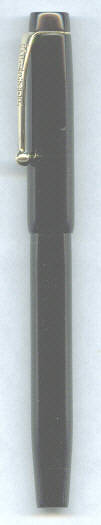 favorite pens. There is something about the very plain black plastic appearance of these pens that attracts me to them. There is another version of these, not often seen, pens that had two cap bands. This pen is about the same length as a Duofold Senior. It is 5 inches or 12.5 cm. My pictures do not do justice to the beauty of the pen. It is slender the cap is 7/16" and the barrel diameter is 3/8". The gold filled clip has no brassing, and it has no damage of any sort. The nib is an Extra Fine Ultra-Flexible "Lucky Cruve", and an exceptionally smooth writer. The condition is Excellent plus.